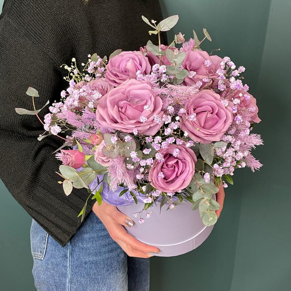 Гипсофила – 2 шт.Лента – 1 шт.Эвкалипт – 1 шт.Роза одноголовая – 7 шт.Коробка шляпная – 1 шт.Аспарагус – 1 шт.Оазис флористический – 1 шт.