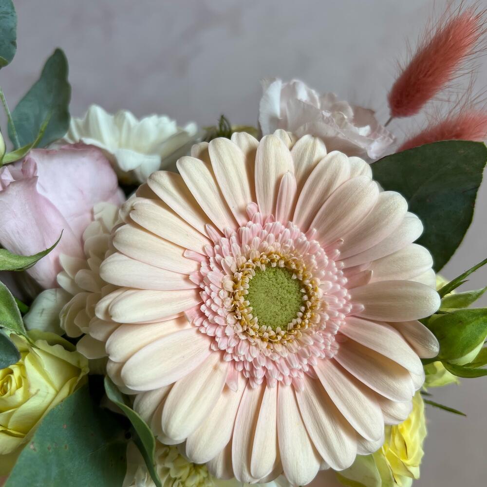 Стакан – 1 шт.Флористическая губка (оазис) – 1 шт.Гербера – 1 шт.Кустовая роза – 1 шт.Кустовая хризантема – 1 шт.Лизиантус – 1 шт.Эвкалипт – 1 шт.Лагурус – 3 шт.