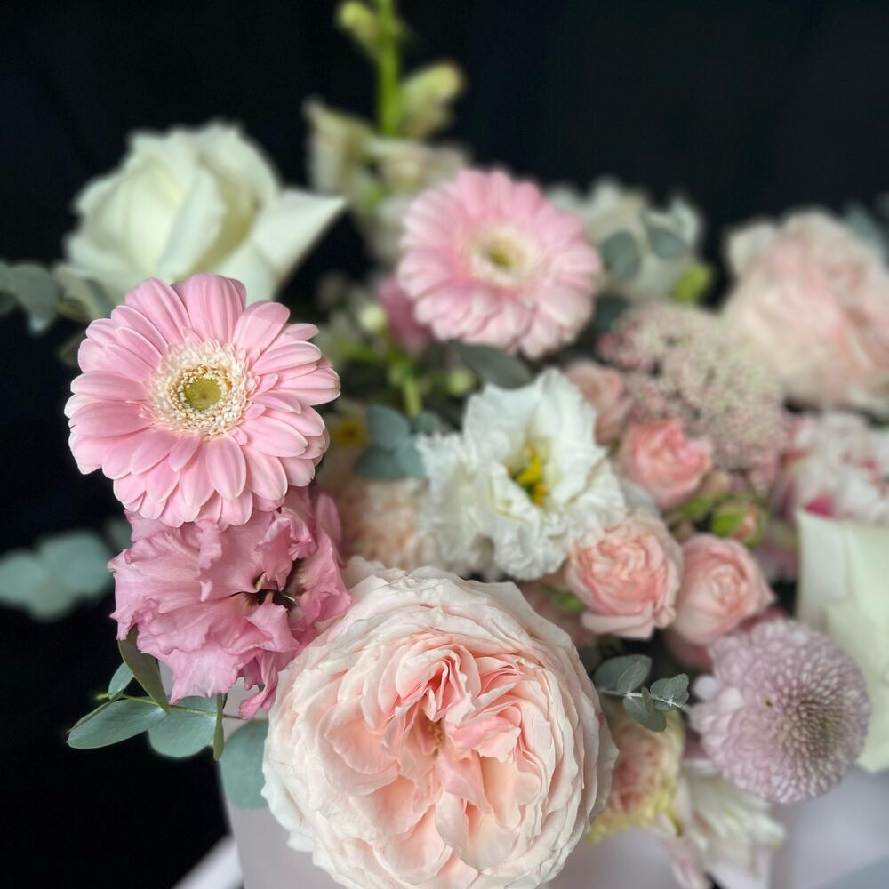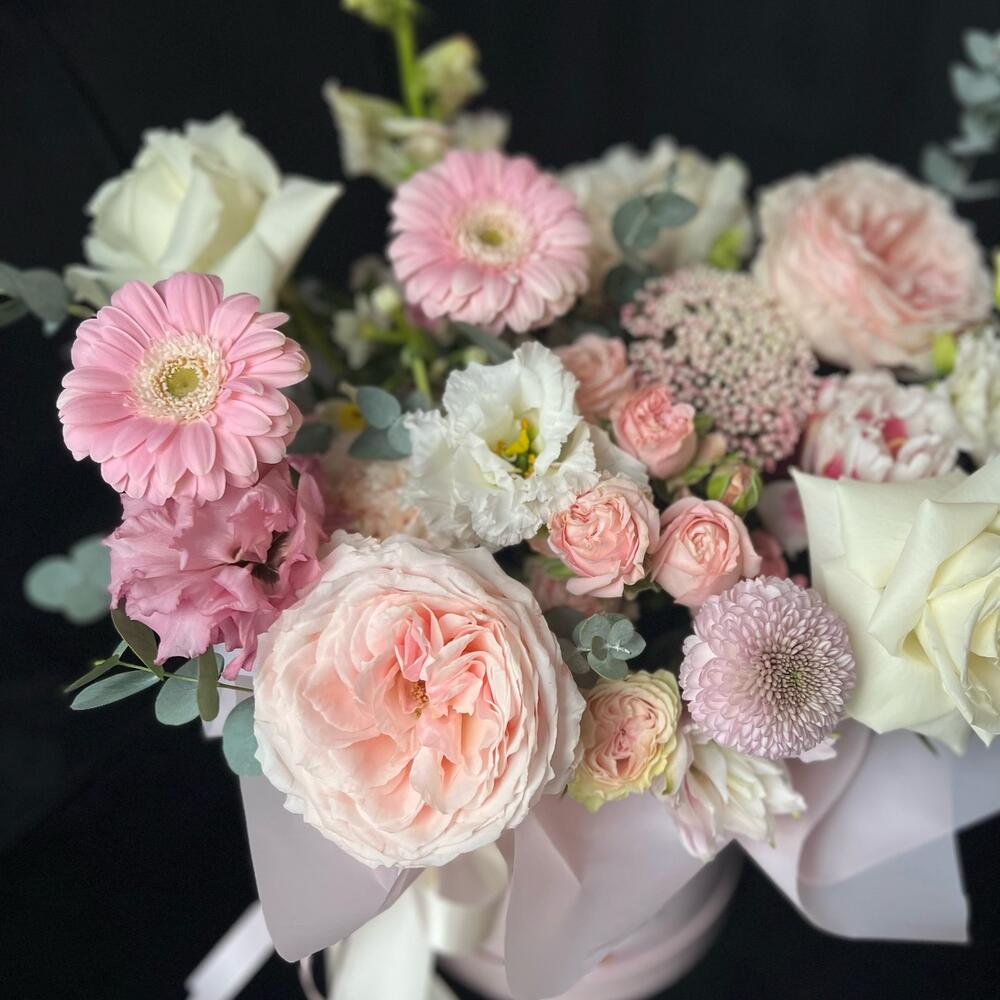 Пионовидная роза – 5 шт.Кустовая роза – 3 шт.тюльпаны – 3 шт.Хризантема – 2 шт.Гербера – 3 шт.Лизиантус – 4 шт.Озотамнус – 2 шт.антиринум – 2 шт.Эвкалипт – 3 шт.Шляпная коробка – 1 шт.Флористическая губка (оазис) – 1 шт.Атласная лента – 1 шт.