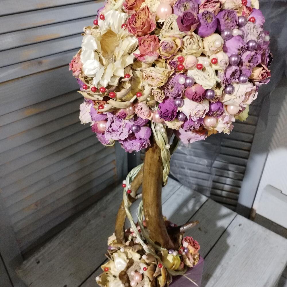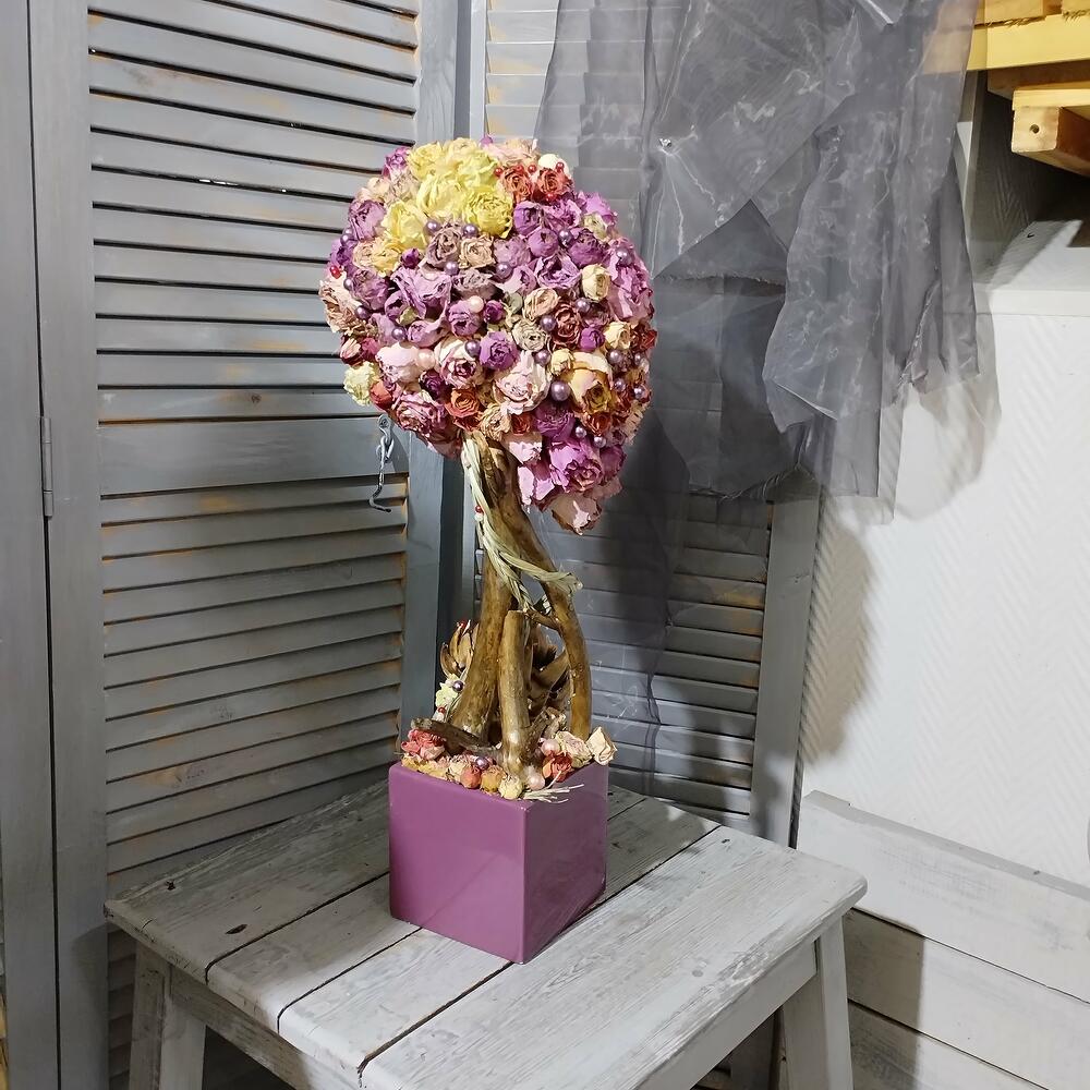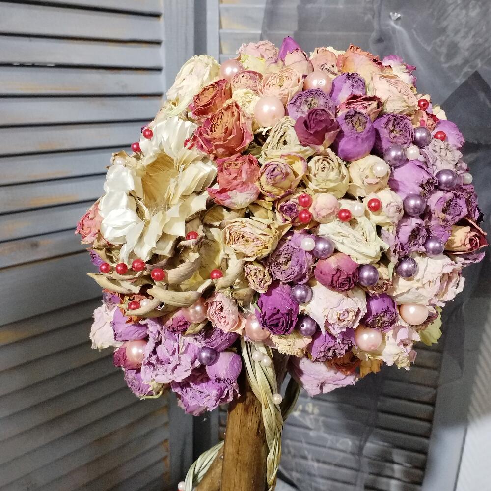 коряга – 3 шт.натуральный засушеный берграсс – 2 шт.засушеная протея – 2 шт.Кашпо керамическое – 1 шт.жемчужена искусственная – 76 шт.натуральная засушеная роза – 1 шт.