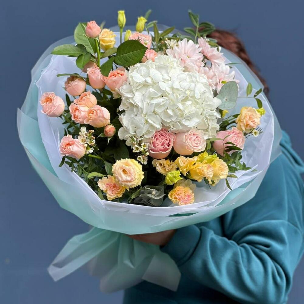 Гортензия – 1 шт. Лента – 1 шт. Хризантема кустовая – 1 шт. Эвкалипт – 3 шт. Эустома – 2 шт. Фисташка – 5 шт. Роза голландия – 3 шт. Упаковка дизайнерская – 7 шт. Роза пионовидная спрей – 3 шт.