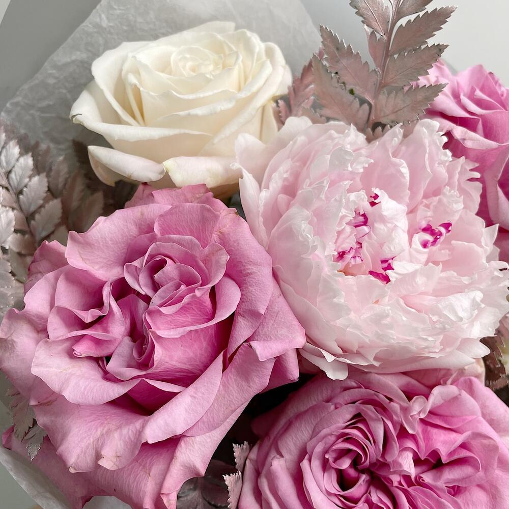Роза белая – 3 шт.Пион Сара Бернар – 1 шт.Роза розовая пионовидная – 3 шт.папоротник крашеный – 2 шт.