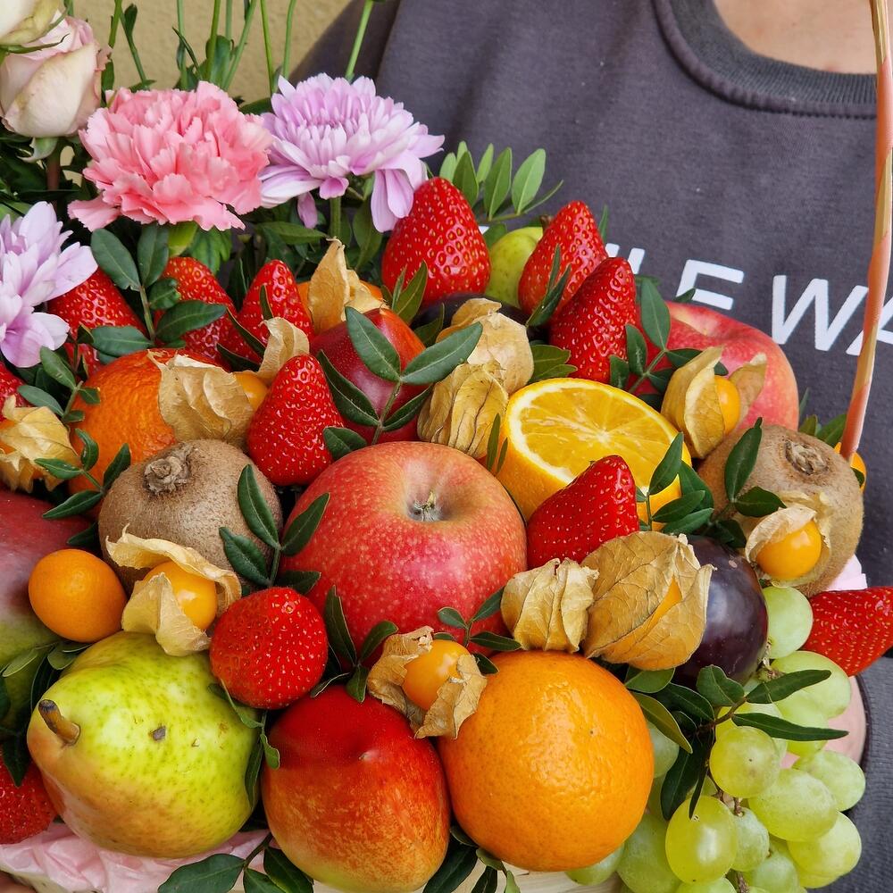 Клубника – 250 гр.Корзина – 1 шт.Гвоздика – 1 шт.Киви – 2 шт.Яблоко – 2 шт.Апельсин – 1 шт.Мандарин – 3 шт.Физалис – 50 гр.Груша – 2 шт.Слива – 2 шт.манго – 1 шт.Нектарин – 2 шт.Виноград гроздь – 1 шт.декоративная зелень – 2 шт.хризантема ветка – 1 шт.роза кустовая ветка – 1 шт.