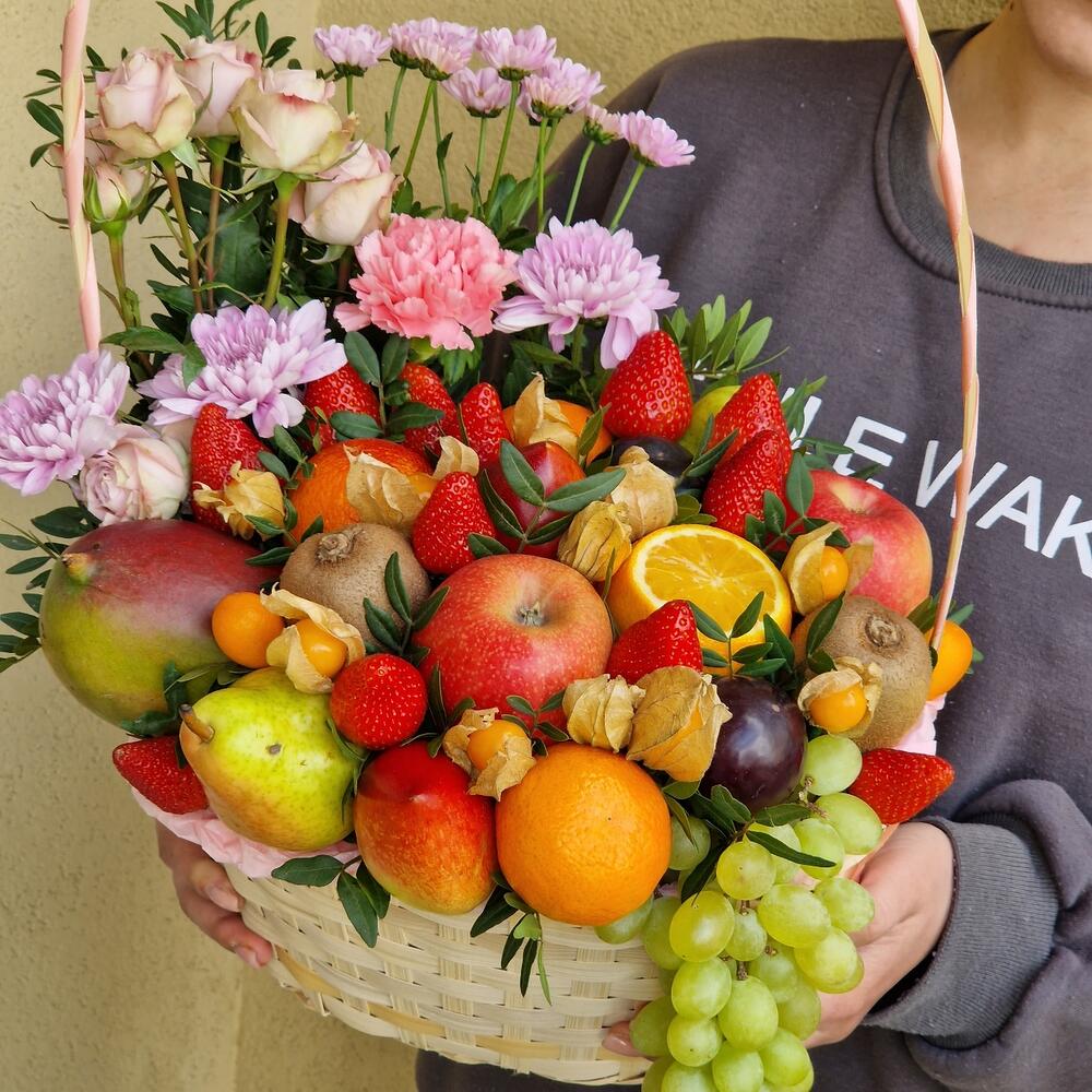 Корзина , в которой прекрасно сочетаются фрукты , ягоды и цветочная композиция.