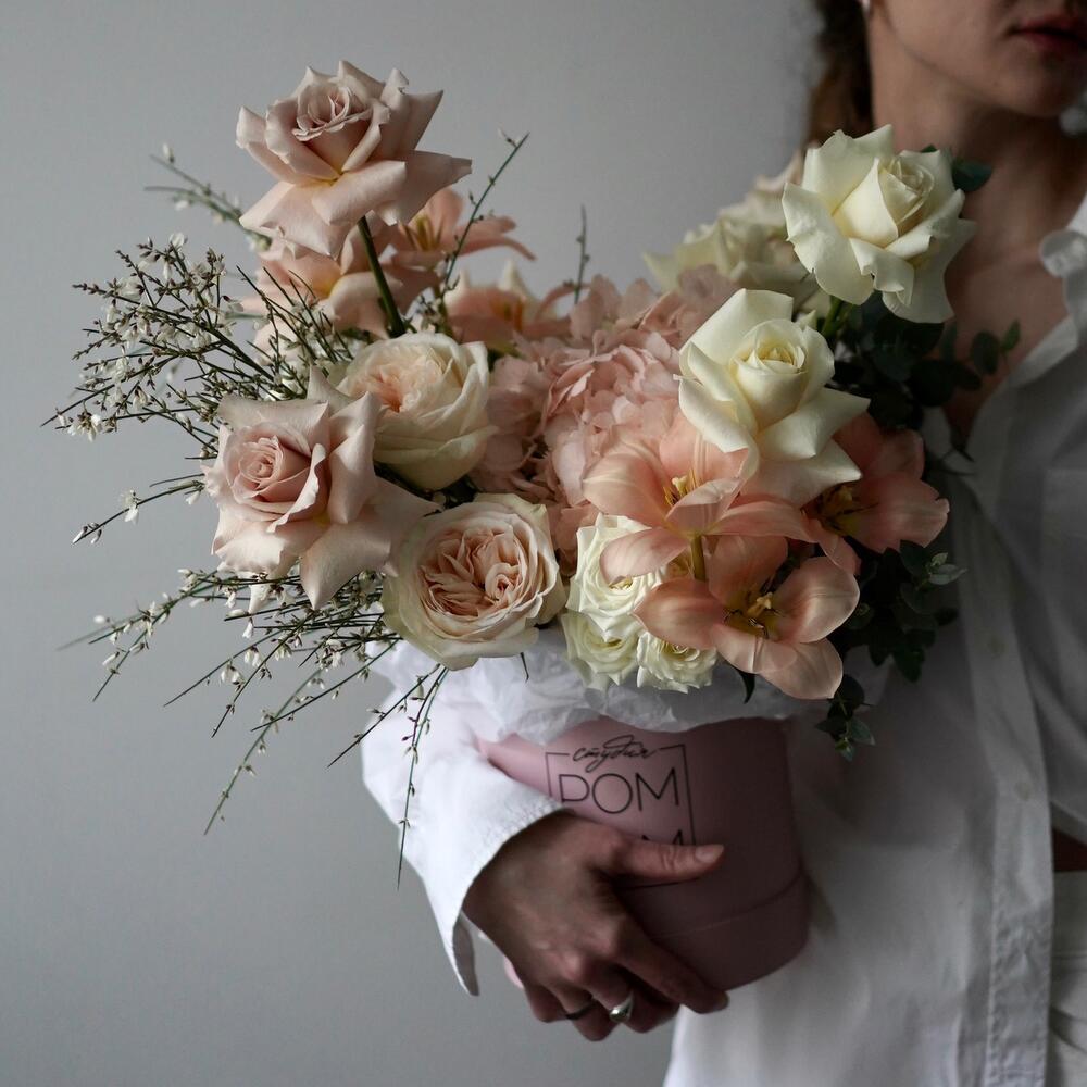 Роза – 12 шт.Гортензия – 1 шт.Эвкалипт – 1 шт.Гениста – 1 шт.Тюльпан – 5 шт.Гвоздика – 5 шт.Коробка шляпная – 1 шт.