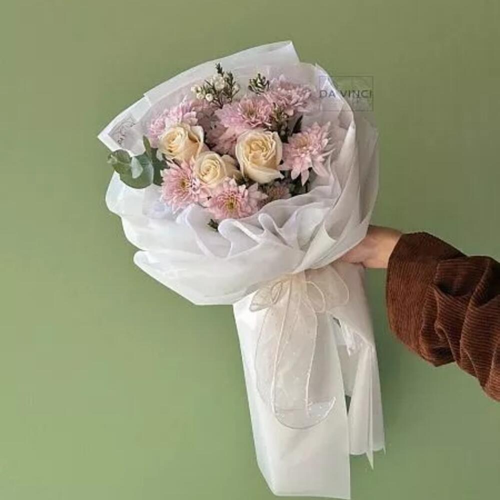 Роза голландская 60 см – 3 шт. Хризантема кустовая – 2 шт. Ваксфлауэр – 1 шт. Эвкалипт – 2 шт.