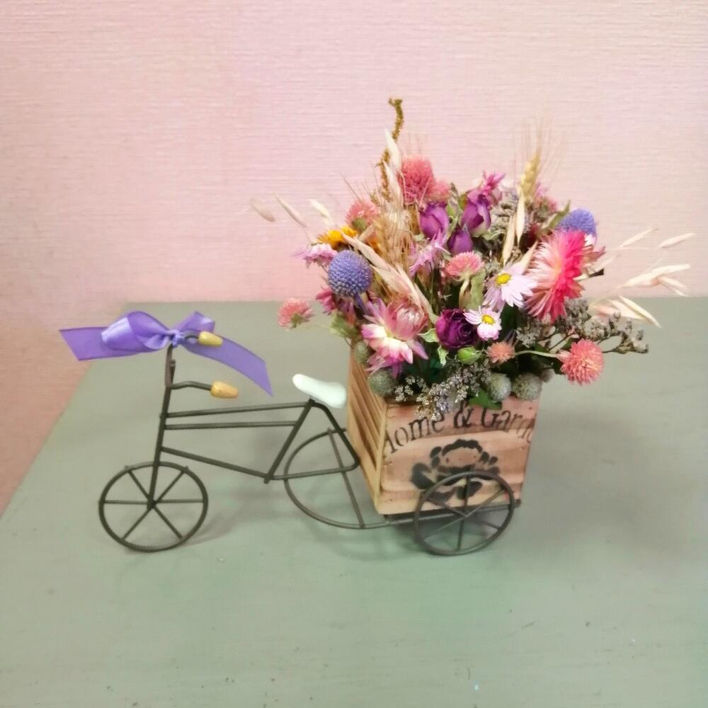 гелихризум (сухоцвет) – 15 шт.Краспедия – 3 шт.Пшеница – 3 шт.Роза кустовая сухоцвет – 1 шт.овес сухоцвет – 1 шт.клевер сухоцвет – 1 шт.Оазис флористический – 1 шт.велосипед декоративный – 1 шт.