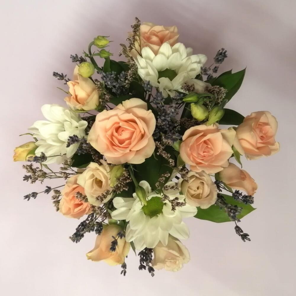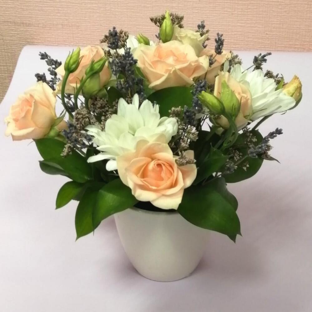 Роза кустовая – 2 шт.Фисташка – 1 шт.Лаванда (сухоцвет) – 10 шт.Лимониум – 1 шт.Оазис флористический – 1 шт.Кашпо керамическое – 1 шт.Хризантема кустовая – 1 шт.