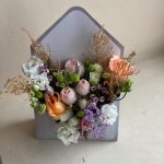 Хризантема кустовая – 2 шт.Роза – 1 шт.Эустома – 2 шт.Фисташка пучок – 1 шт.Оазис флористический – 1 шт.конверт картонный – 1 шт.сухоцветы пучок – 2 шт.