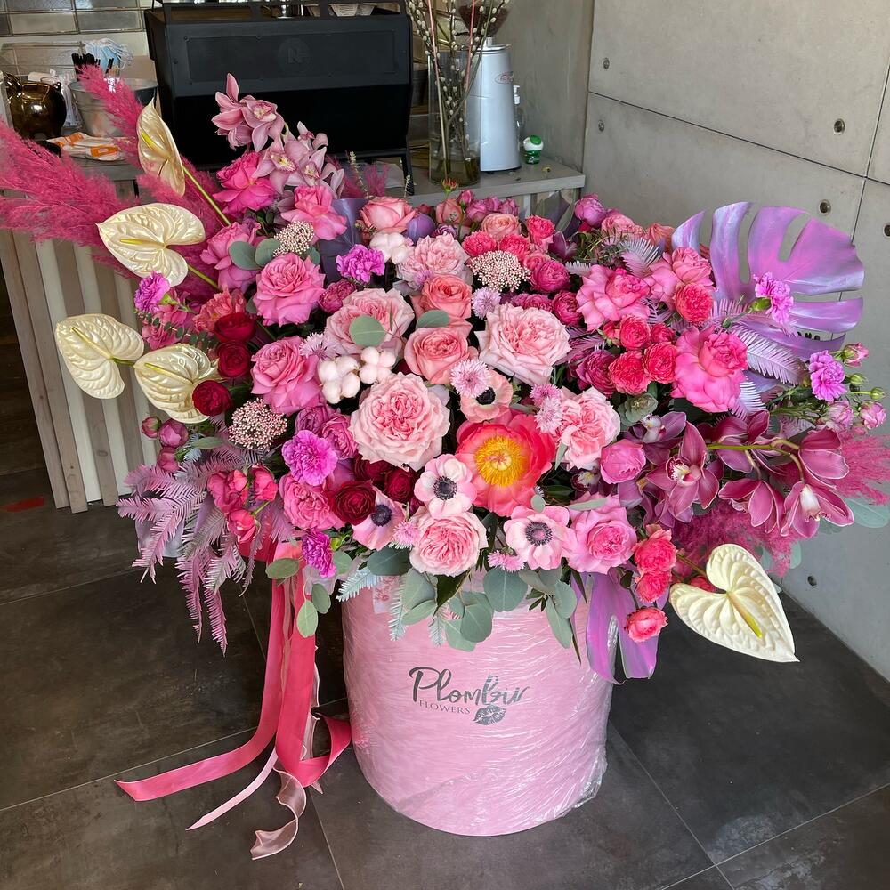 садовая роза хитоми – 12 шт.пионовидная роза квинс кроун – 15 шт.Антуриум – 5 шт.Орхидея Цимбидиум ветка – 3 шт.Озотамнус – 5 шт.роза джульетта церайз – 10 шт.Диантус – 15 шт.Роза ред лейс – 10 шт.роза пионовидная пинк экспрешн – 15 шт.Хлопок – 7 шт.Роза пионовидная misty bubbles – 15 шт.Анемон – 7 шт.Скабиоза – 5 шт.Монстера – 2 шт.кортадерия – 5 шт.рускус стабилизированный – 5 шт.Эвкалипт – 20 шт.Пион – 3 шт.