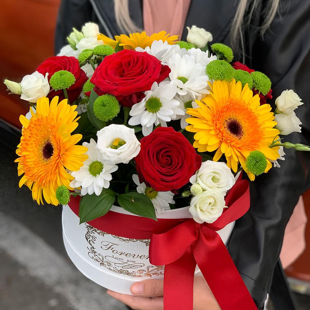 Роза красная – 3 шт. Коробка шляпная – 1 шт. Хризантема зеленая – 2 шт. Гербера желтая – 3 шт. Хризантема белая – 1 шт. эустома белая – 2 шт.