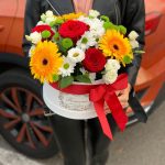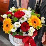 Стильная композиция в коробке из ярких оттенков цветов. Такую композицию можно подарить на любой повод или просто так – для отличного настроения.