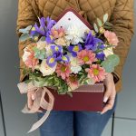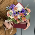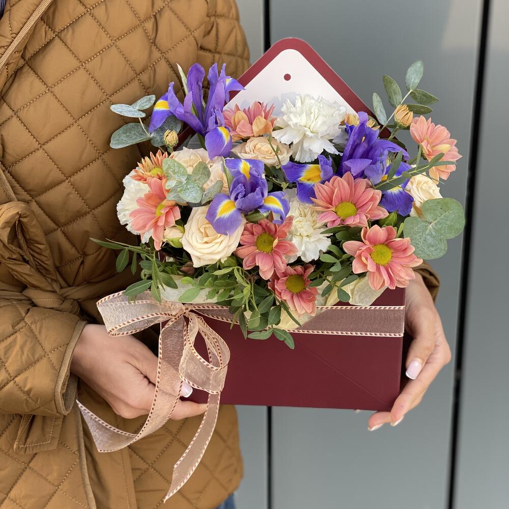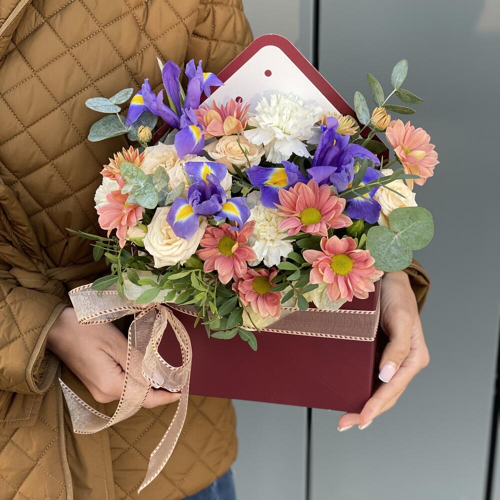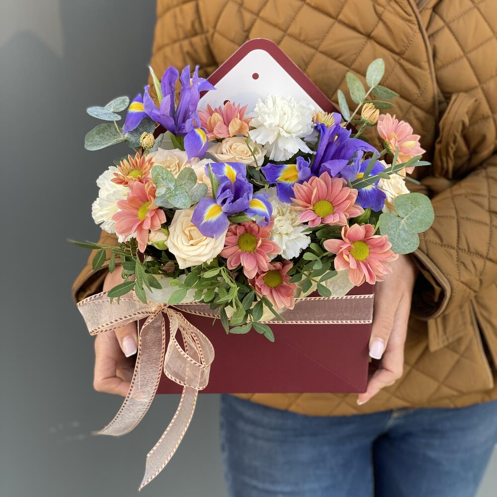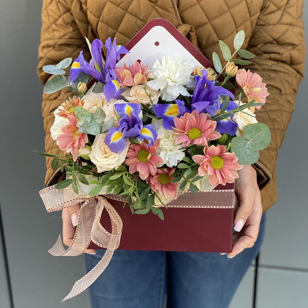 Конверт с цветами из ирисов, хризантемы, кустовой розы, сортовой гвоздики и зелени!