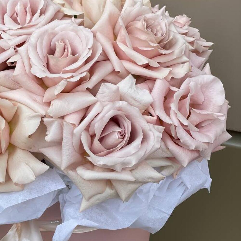 Роза Эквадор – 11 шт.Лента атласная – 1 шт.Тишью – 4 шт.Шляпная коробка – 1 шт.Оазис флористический – 2 шт.лента силиконовая брендированная – 1 шт.