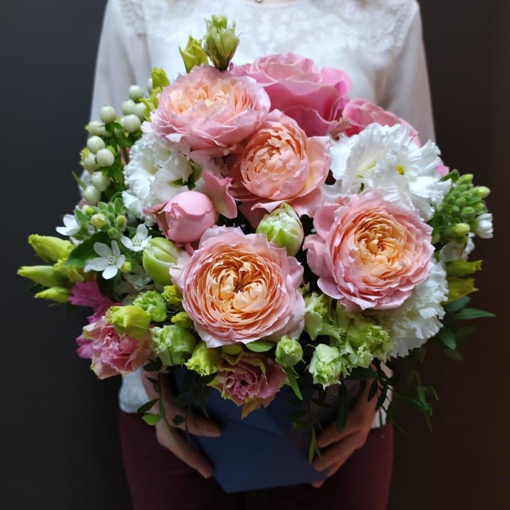 Коробка с пионовидной розой, эрингиумом и матиолой