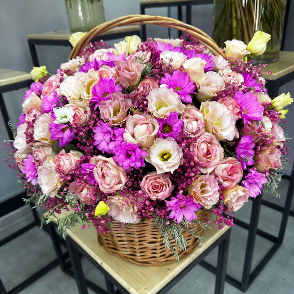 Роза – 29 шт. Хризантема – 33 шт. Эустома – 11 шт. Корзина плетеная – 1 шт. декоративная зелень – 5 шт.