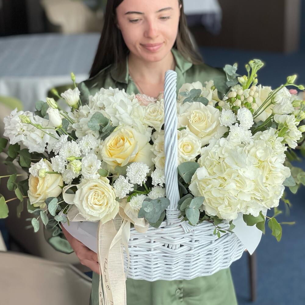 Гортензия – 2 шт.Роза – 6 шт.Хризантема кустовая – 4 шт.Лизиантус – 3 шт.Эвкалипт – 1 шт.бант атласный – 1 шт.
