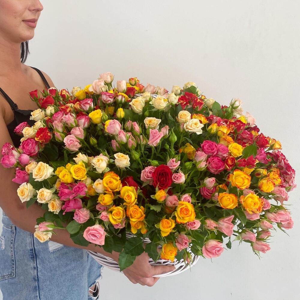 Роза кустовая – 81 шт.Корзина плетеная – 1 шт.Оазис флористический – 3 шт.