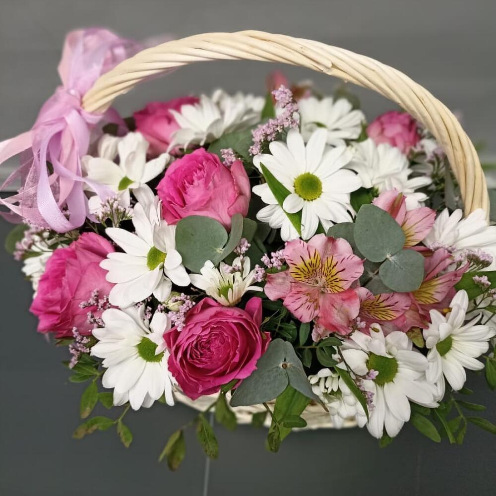 пионовидная кустовая роза misty bubbles – 3 шт.Альстромерия – 3 шт.Хризантема кустовая – 3 шт.Эвкалипт – 5 шт.Фисташка – 10 шт.Лимониум – 2 шт.Корзина плетеная – 1 шт.Оазис флористический – 1 шт.Лента атласная – 2 шт.