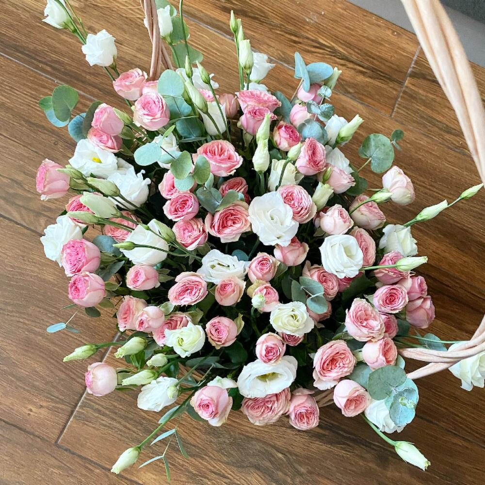 Лизиантус – 10 шт.Роза кустовая – 15 шт.Эвкалипт – 7 шт.Корзина плетеная – 1 шт.Оазис флористический – 1 шт.