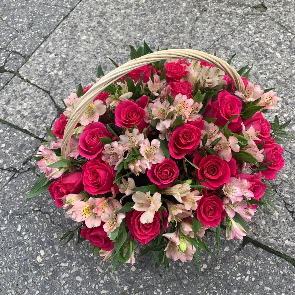 Роза – 25 шт.Альстромерия – 20 шт.Рускус – 15 шт.Оазис флористический – 2 шт.Корзина плетеная – 1 шт.