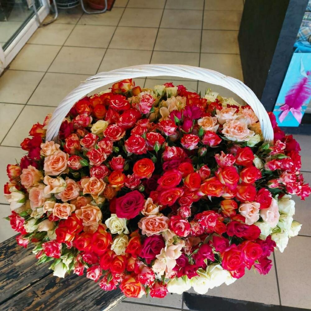 Роза кустовая – 101 шт.Корзина плетеная – 1 шт.Оазис флористический – 2 шт.