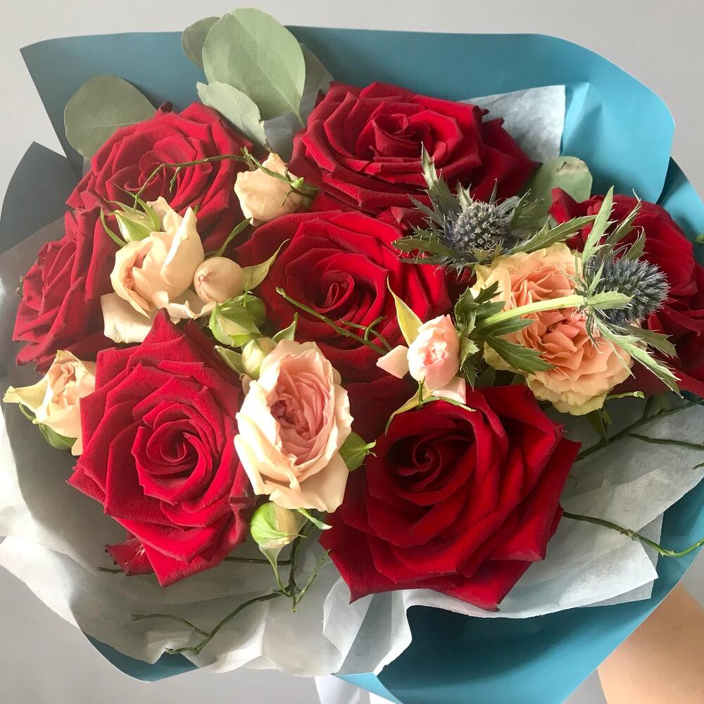 Роза Эксплорер – 7 шт.Роза кустовая – 1 шт.Эрингиум синий – 3 шт.Тишью – 2 шт.Упаковка дизайнерская – 4 шт.Лента атласная – 1 шт.
