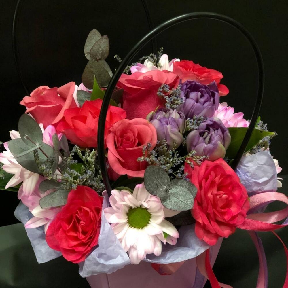 Рускус – 3 шт.Роза – 3 шт.Тюльпан – 3 шт.Роза кустовая – 2 шт.Сумочка – 1 шт.Хризантема кустовая – 1 шт.Оазис флористический – 1 шт.Лимониум – 1 шт.эвкалипта – 1 шт.