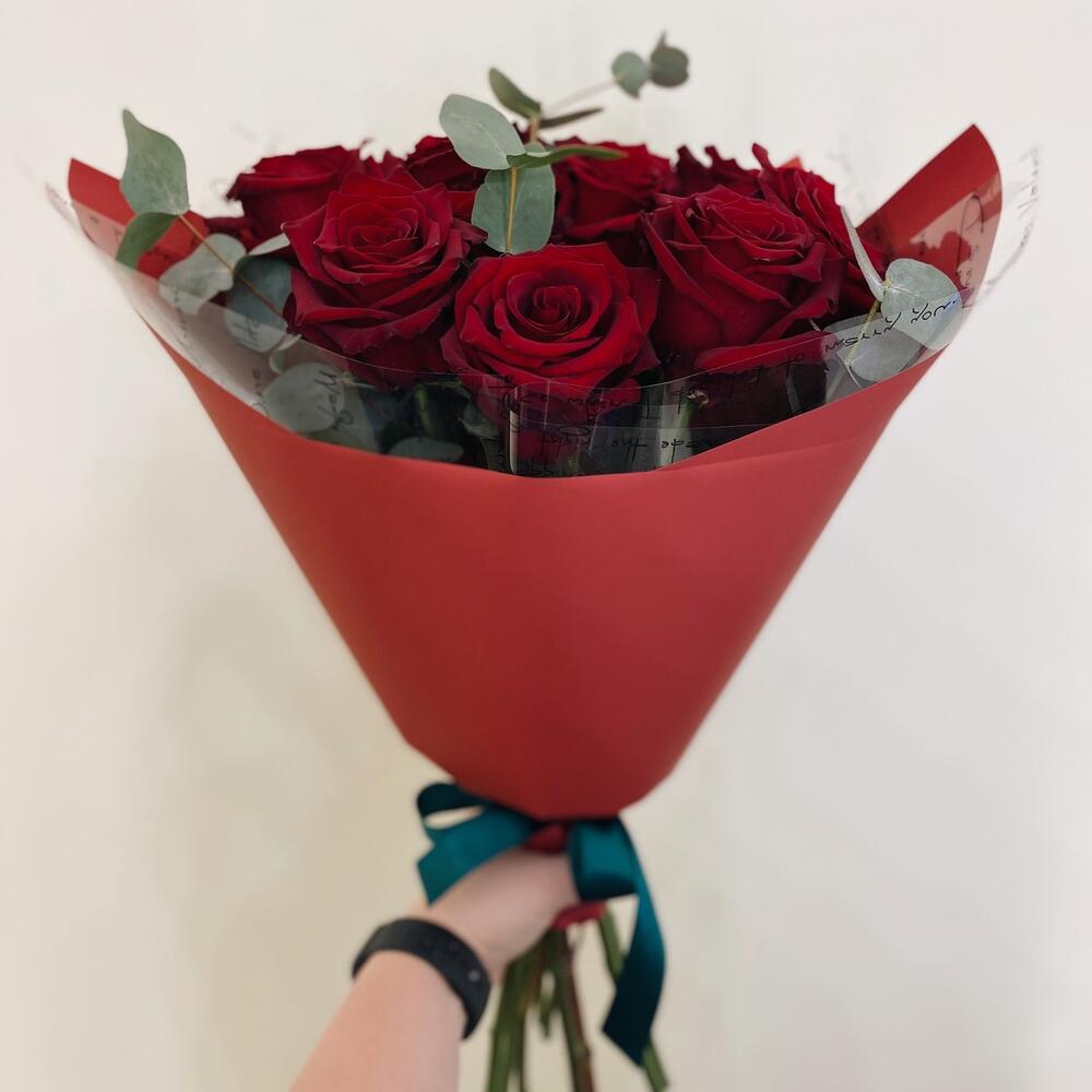 Роза Эквадор – 9 шт.Эвкалипт Синерия – 2 шт.Упаковка дизайнерская – 2 шт.Лента атласная – 1 шт.