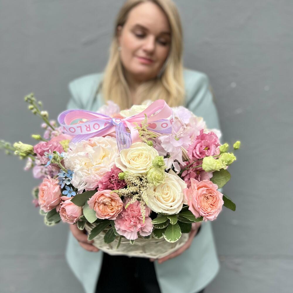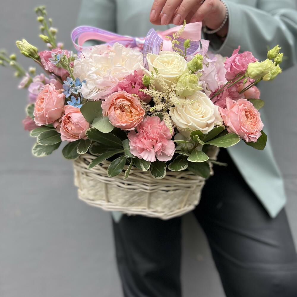 Корзина – 1 шт.Оазис – 1 шт.Пионовидная роза – 1 шт.Лизиантус – 2 шт.пионовидные кустовые розы – 3 шт.Маттиола – 2 шт.Роза Россия – 3 шт.Оксипеталум – 1 шт.Астильба – 1 шт.Зелень – 2 шт.Гвоздика – 5 шт.