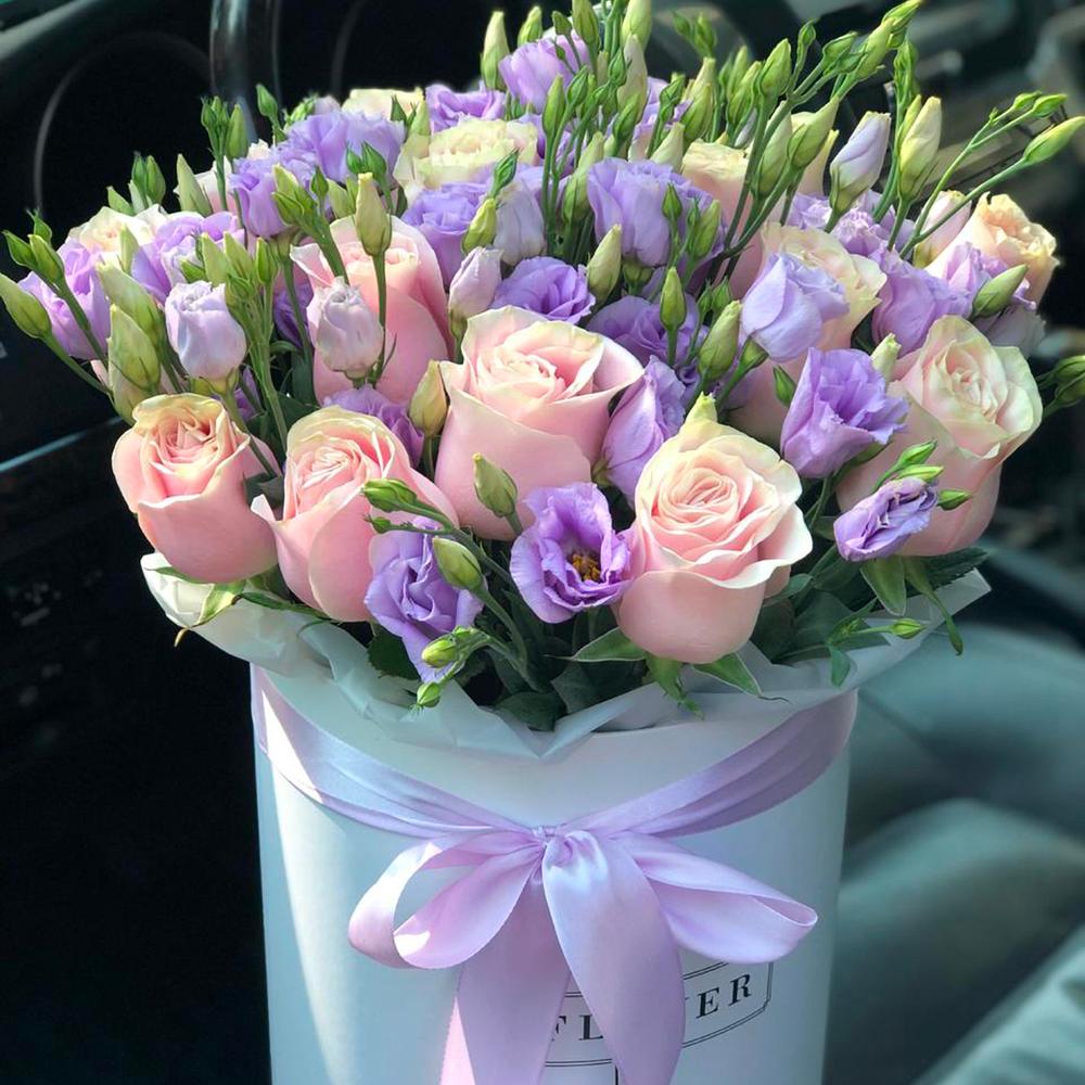 Коробка шляпная – 1 шт. эустома лиловая – 10 шт. Роза пинк мондиаль – 15 шт.