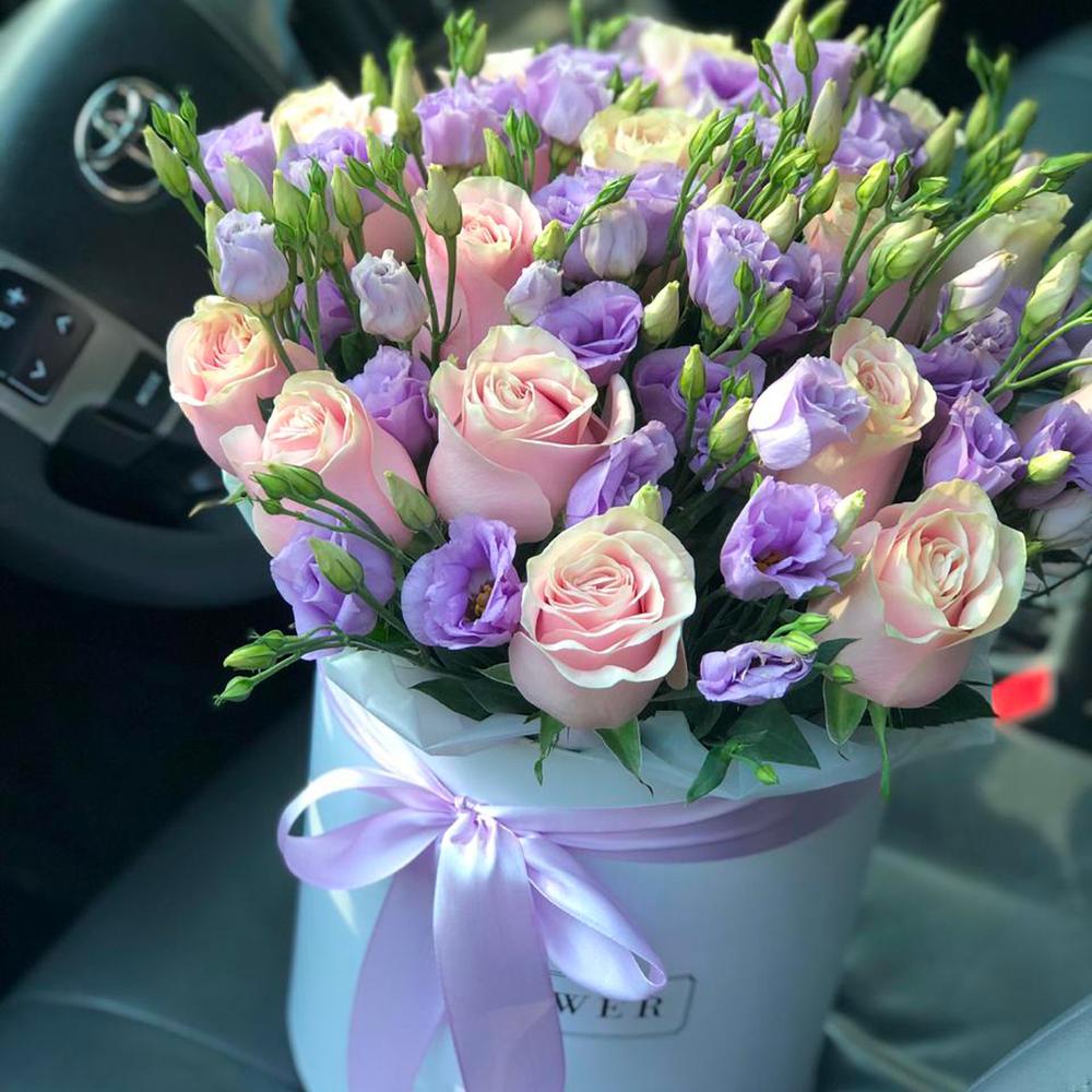 Чудесная композиция в коробке из нежных оттенков роз и лиловых эустом.