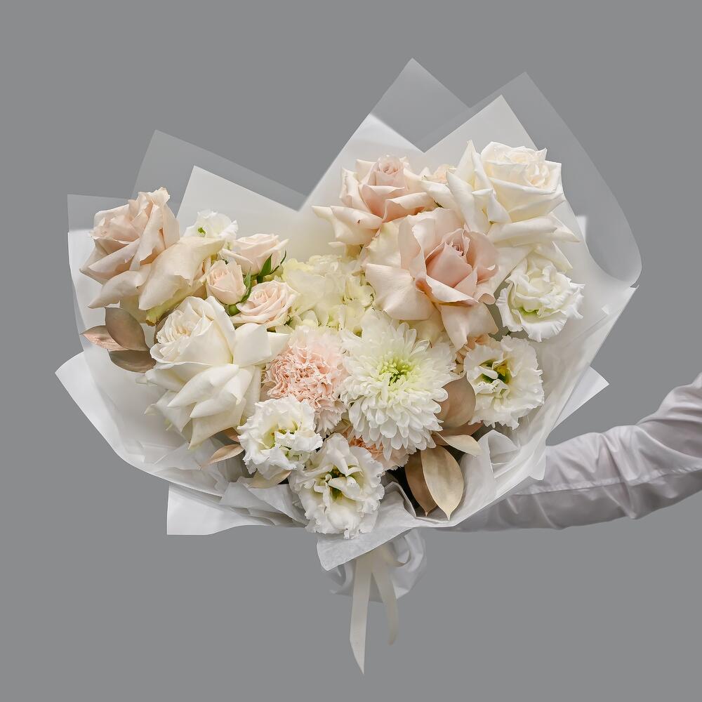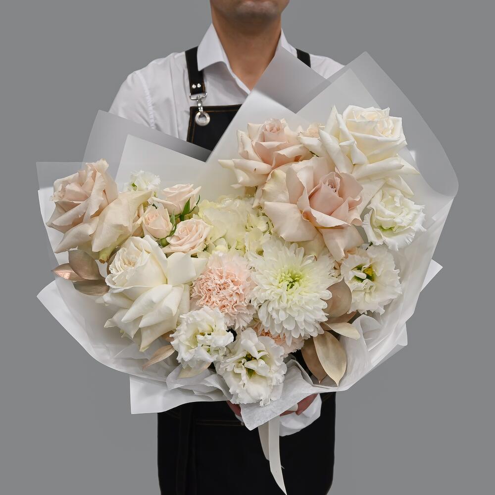 Французская роза – 5 шт.Эустома – 2 шт.Гвоздика – 2 шт.Роза кустовая – 2 шт.Рускус – 3 шт.Хризантема – 1 шт.Гортензия – 1 шт.Упаковка дизайнерская – 1 шт.