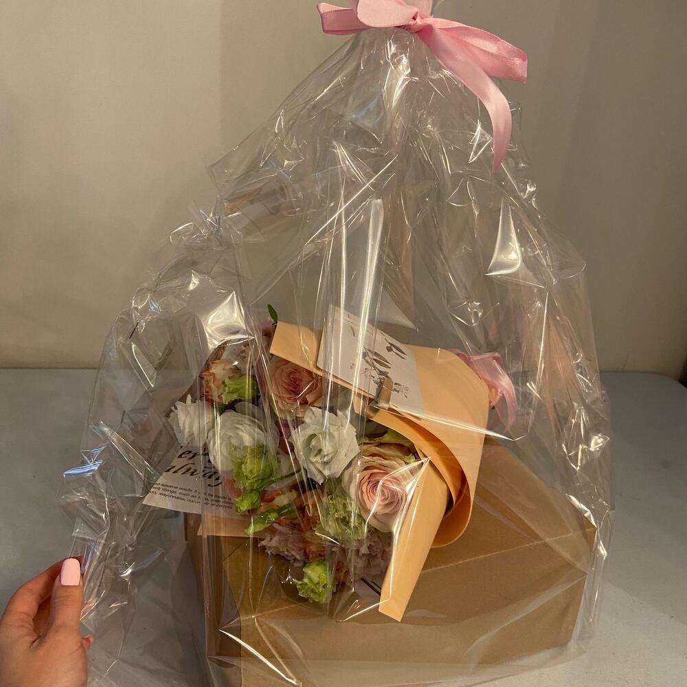 Упаковка – 1 шт.Лента атласная – 1 шт.Упаковка дизайнерская – 1 шт.крафтовая коробка – 1 шт.розы кустовые – 5 шт.розы одноголовые – 5 шт.лизтантус – 6 шт.поздравительная открытка – 1 шт.сладости микс по согласованию с клиентом – 10 шт.Открытка мини – 1 шт.