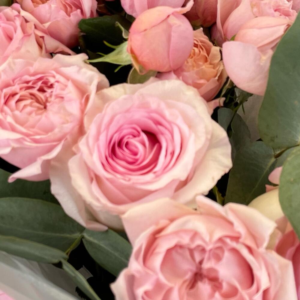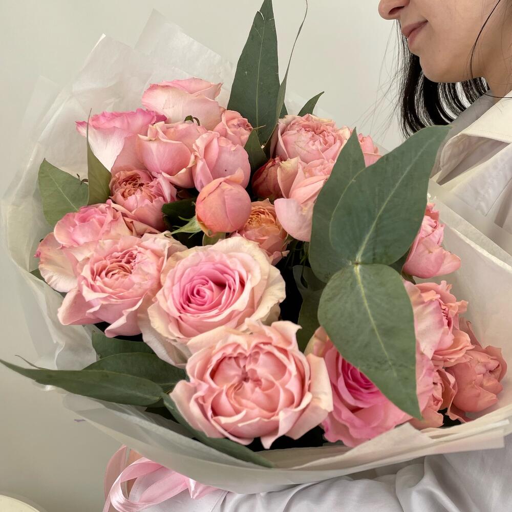Эвкалипт – 2 шт.Роза – 5 шт.Тишью – 2 шт.Кустовая пионовидная роза – 4 шт.Упаковка дизайнерская – 1 шт.