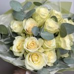 Роза персиковая – 15 шт. эвкалипт круглый или длинный – 9 шт. Упаковка дизайнерская – 2 шт. Открыточка с вашими пожеланиями – 1 шт. инструкция по уходу за цветами – 1 шт.