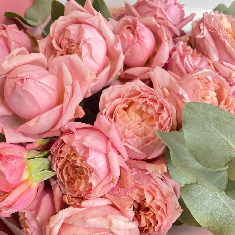 Эвкалипт – 2 шт.Упаковка дизайнерская – 2 шт.Пионовидная кустовая роза – 5 шт.комплимент от polyanka – 1 шт.