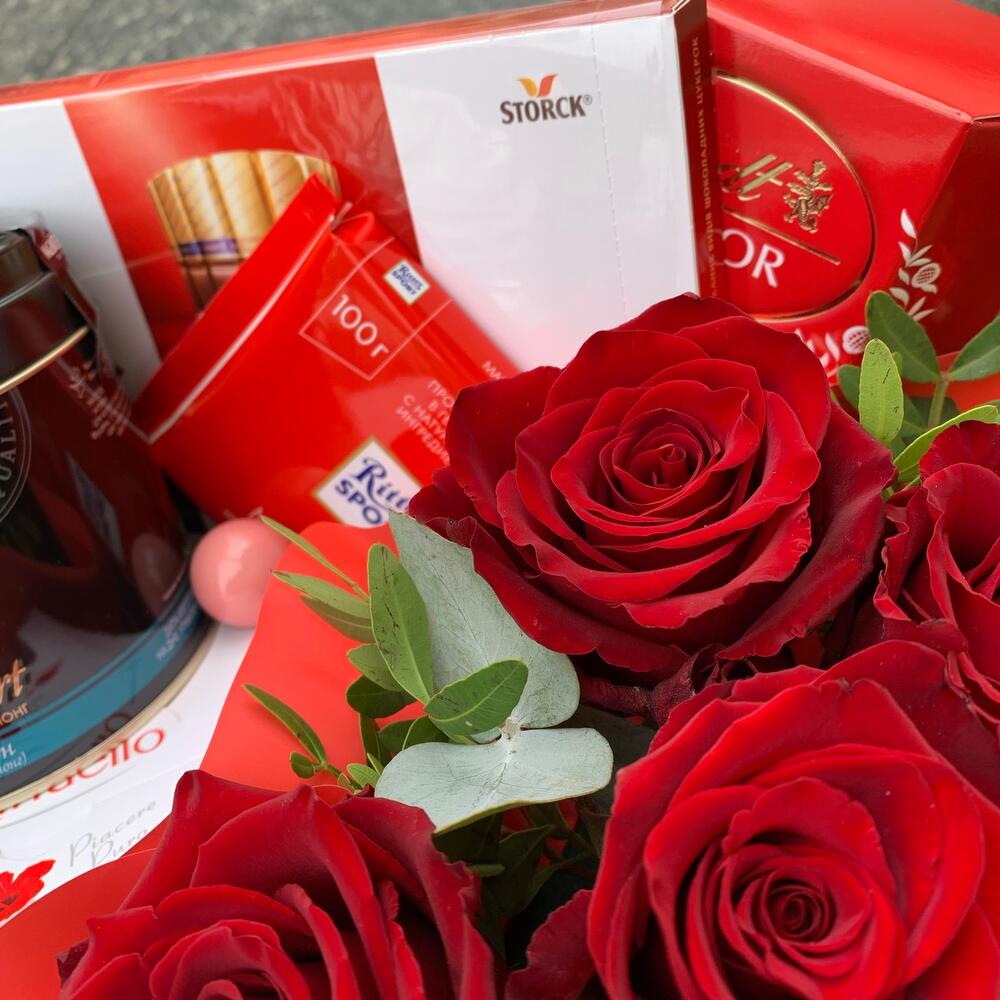 Конфеты Мерси – 1 шт.конфеты раффаэлло – 1 шт.Шоколад линдор – 1 шт.Шоколад риттер спорт – 1 шт.Чай в жестяной банке – 1 шт.роза или тюльпан – 5 шт.Оазис – 1 шт.Упаковка – 1 шт.Корзина – 1 шт.Декор – 1 шт.