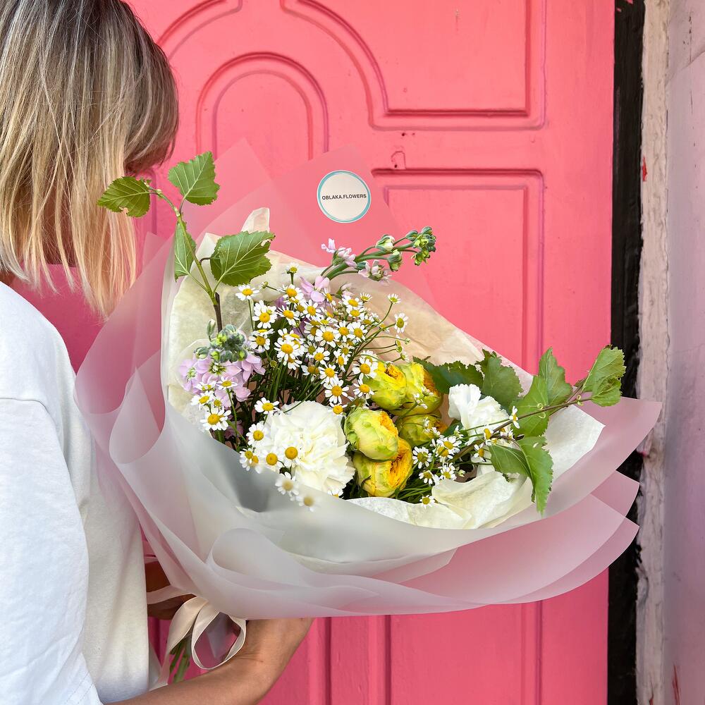 Маттиола – 2 шт.Лента атласная – 1 шт.Тишью – 1 шт.Диантус – 2 шт.Ветки березы – 2 шт.Аквапак – 1 шт.Матрикария (Ромашка Камила) – 3 шт.Корейская пленка – 3 шт.Инструкция по уходу – 1 шт.транспортировочная упаковка – 1 шт.кустовая садовая роза – 1 шт.