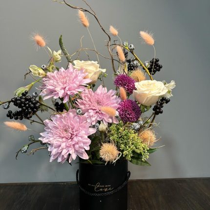 Центральным элементом этого букета микс цветов является красивый и стильный чемоданчик. Этот чемоданчик служит не только как контейнер, но и как часть композиции. Он придает букету оригинальность и изысканность, создавая атмосферу путешествий и приключений.