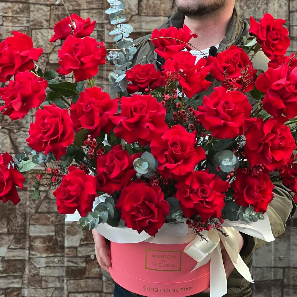 Шикарнейшая композиция из красных голландских роз в сочетании с эвкалиптом, хамелациумом и различной зеленью очарует и поразит кого угодно