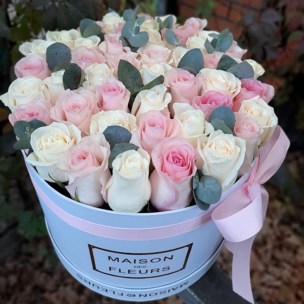 Композиция в фирменной большой коробке из 45 роз (розовые и белые) с добавлением голландской зелени.