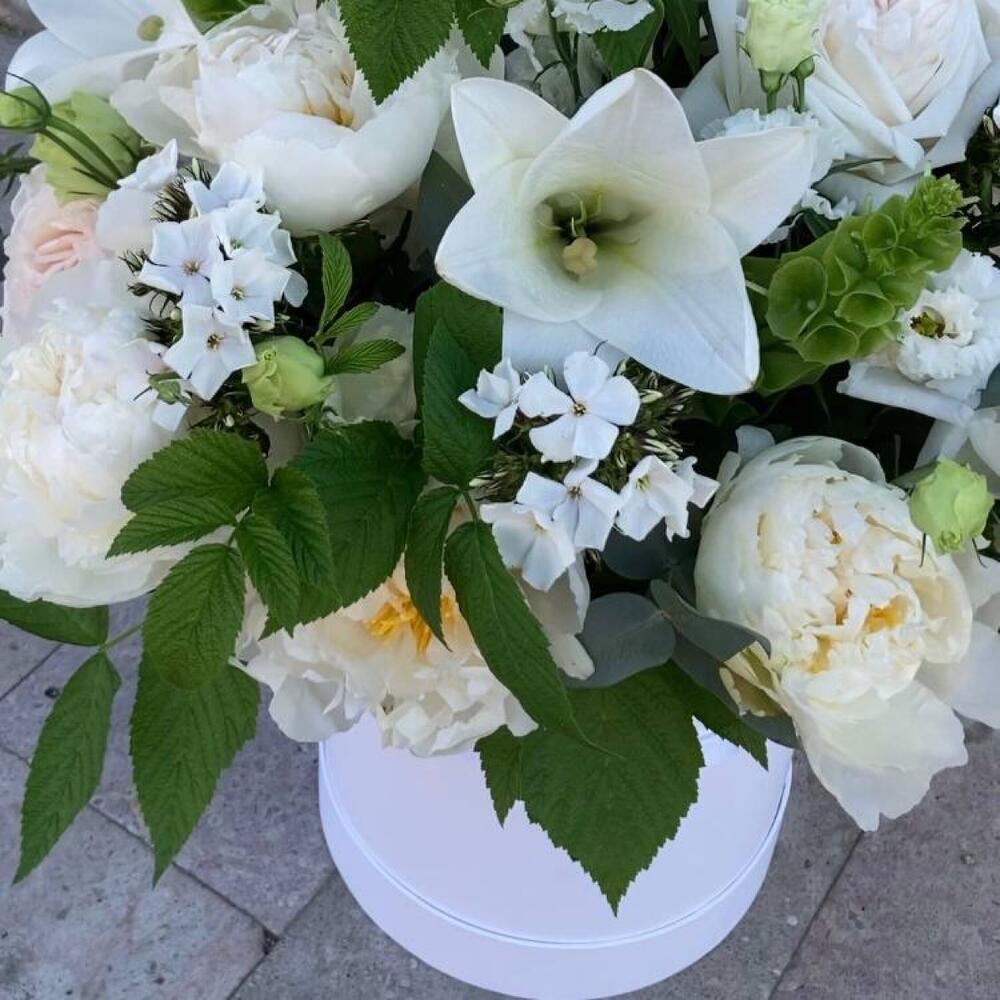 Композиция в шляпной коробке с лилиями, ирландскими колокольчиками, эвкалиптом, пионовидными розами и флоксами.
