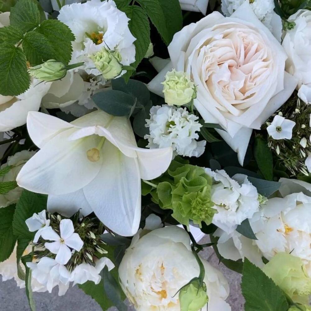 лилия лонг – 3 шт.ирландский колокольчик – 5 шт.Роза пионовидная – 5 шт.Флокс – 5 шт.Лизиантус – 7 шт.Ветки малины – 5 шт.Маттиола – 7 шт.Эвкалипт – 5 шт.Пион – 7 шт.Коробка шляпная – 1 шт.Оазис флористический – 2 шт.