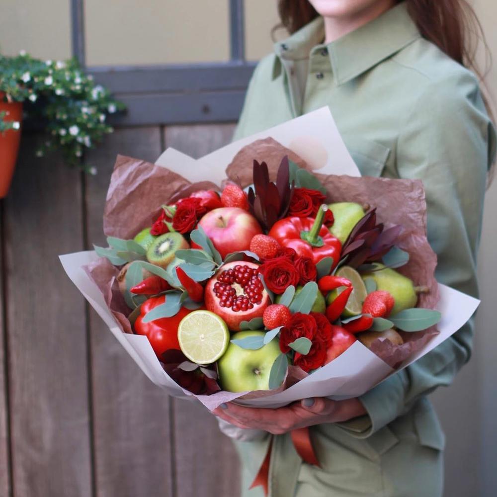 Насыщенный многогранный контрастный букет из овощей, фруктов и цветов – настоящий праздник вкуса и цвета. Летнее и сочное настроение – вот гарантированный результат этого букета.