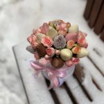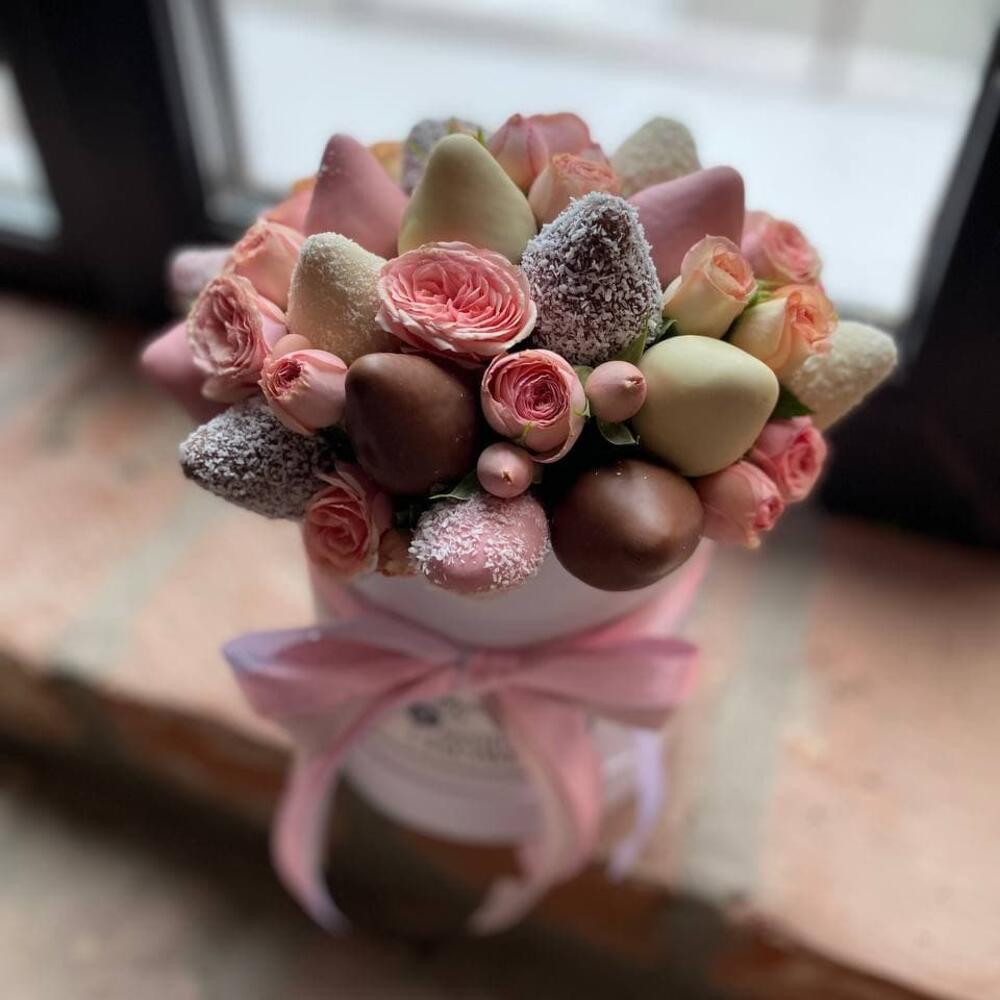Съедобный фруктовый букет из клубники в шоколаде и эустомы в дизайнерской упаковке