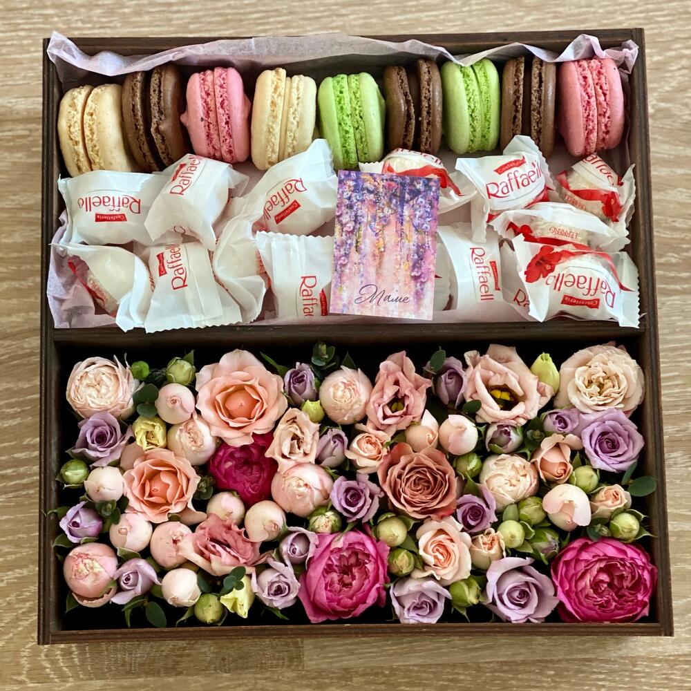 Роза кустовая пионовидная – 10 шт.Ящик деревянный – 1 шт.Оазис флористический – 2 шт.макарон (пирожное) – 9 шт.раффаэлло 150 гр – 1 шт.