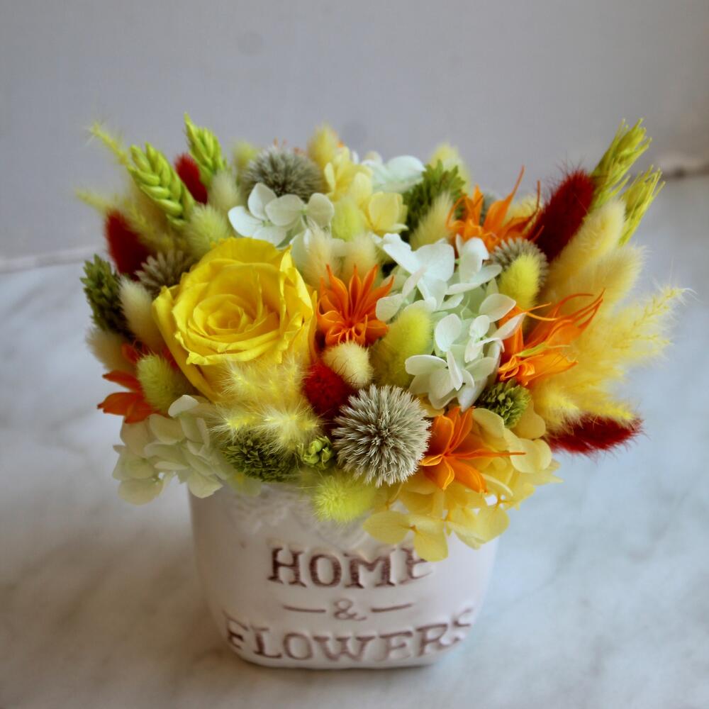 Гортензия – 1 шт.Роза – 1 шт.Колосья – 1 шт.Лагурус – 1 шт.Фаларис – 1 шт.Мордовник – 1 шт.Сетария – 1 шт.Керамическое кашпо – 1 шт.