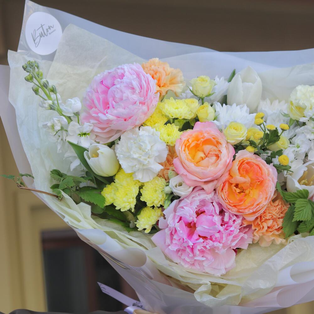 Прекрасный летний букет, созданный из свежайших премиальных цветов: пионов, садовых роз, ароматной маттиолы, лизиантуса, кустовых роз и тюльпанов.Такой букет точно понравится яркой и энергичной получательнице, и будет долго радовать её.К букету прилагается открытка с вашими пожеланиями, инструкцию по уходу за цветами и приятный комплимент от нашего магазина – шоколадка.Мы также будем рады отправить вместе с букетом конфеты, шоколад ручной работы или б/а вино по вашим пожеланиям, просто напишите нам в личные сообщения. Заказывая наш букет, Вы всегда получите исключительный сервис и заботу о клиенте