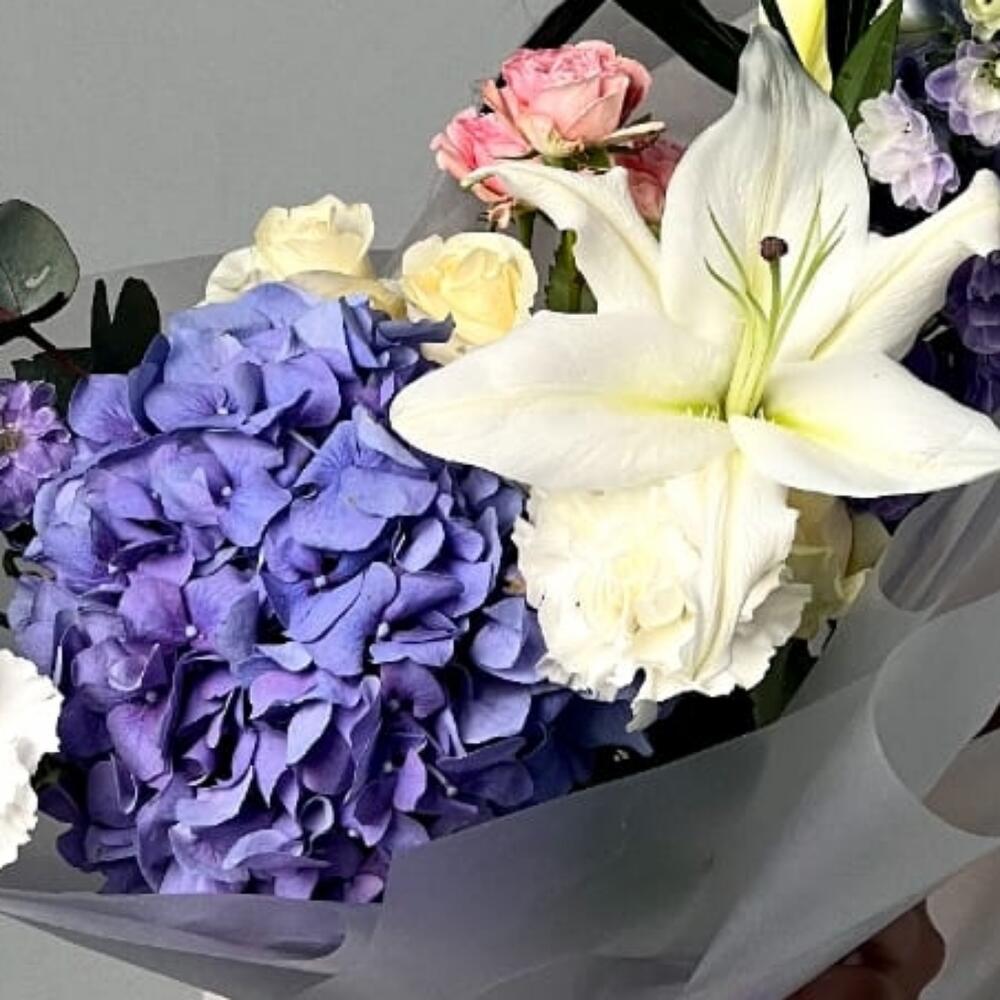 Сборная корзина из гортензий, лизиантусов, гвоздик, хризантем и роз